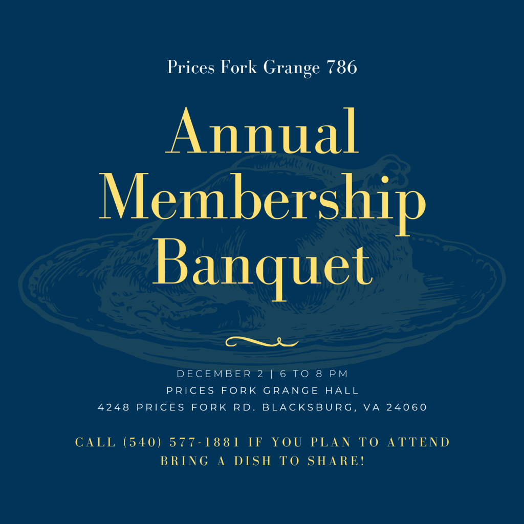 We will be holding our 2025 Membership Banquet at 6:00PM on Tuesday December 2nd, 2025. This will be a potluck event where we will discuss the how our Grange is doing and hand out awards to our amazing members for all they do. This event is also open to the public, if you would like to learn more about the Grange we invite you to come out! Bring your favorite dish to share!