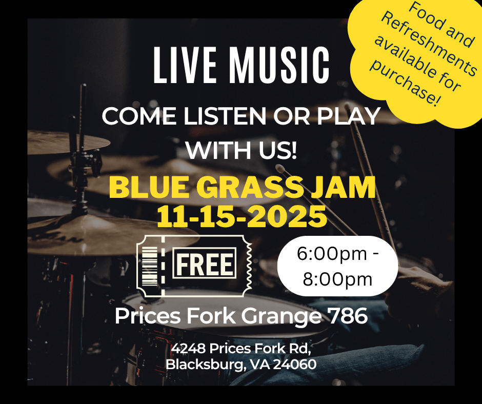 Come out and join us on November 15th from 6:00 till 8:00PM for a Blue Grass Jam! We will have live music and musicians are welcome to come and join in! Admission to the event is completely free! Refreshments and food will be available for purchase! This event will be held at the Prices Fork Grange Hall located at 4248 Prices Fork Rd. Blacksburg, VA 24060.